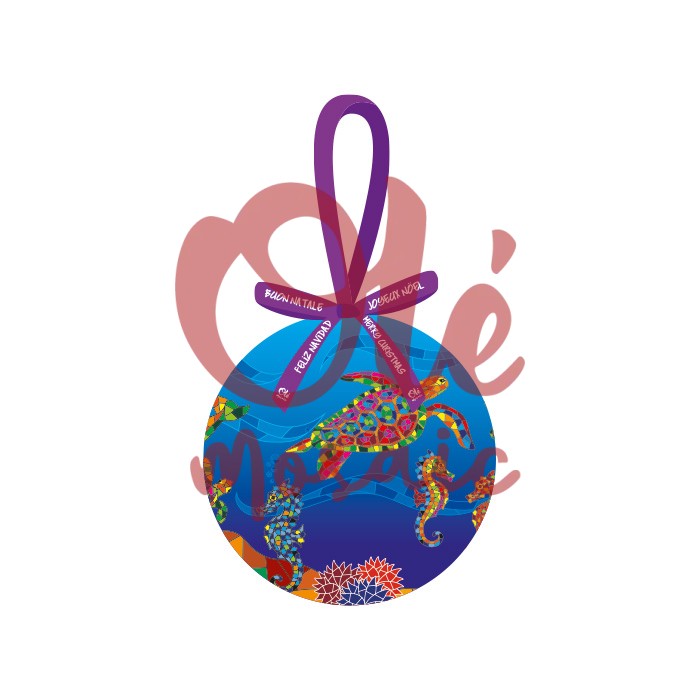 Decorative Christmas bauble presented in an elegant box, perfect for adorning the tree during the holidays. This bauble, crafted from resistant material, displays vibrant marine motifs, such as turtles and seahorses, in a palette of blue, green, and orange colors that evoke the oceanic environment. The colorful details are hand-painted, highlighting the rich marine fauna, making this bauble an original and festive gift that adds an artistic touch to Christmas decoration.