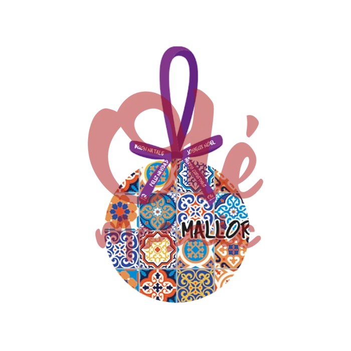 This decorative Christmas bauble is a charming souvenir that encapsulates the vibrant essence of Mallorca in an elegant presentation. Featuring a circular design highlighted by its colorful geometric patterns in blue, orange, and yellow tones, this ornament captures the island’s cultural and artistic tradition. The design is inspired by the famous Mallorcan mosaics, an iconic representation of local heritage that adds a festive touch to any Christmas tree. In the center, the word “MALLORCA” is displayed in a striking style, emphasizing the origin of this precious keepsake.