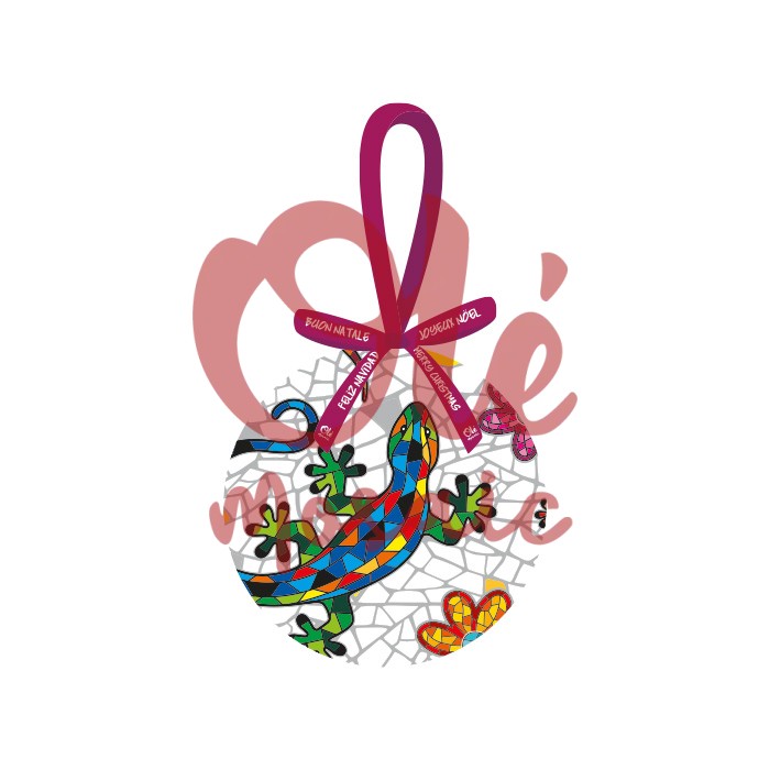 Christmas bauble presented in an elegant box, decorated with a vibrant salamander and flower design. Made of ceramic, this bauble displays an explosion of color in its illustration, with details that evoke Gaudí’s famous trencadís. The scene shows a salamander in green and blue tones, surrounded by yellow and red floral motifs, capturing the essence of Spanish art and folklore. Perfect for adding an artistic touch to your Christmas decoration.