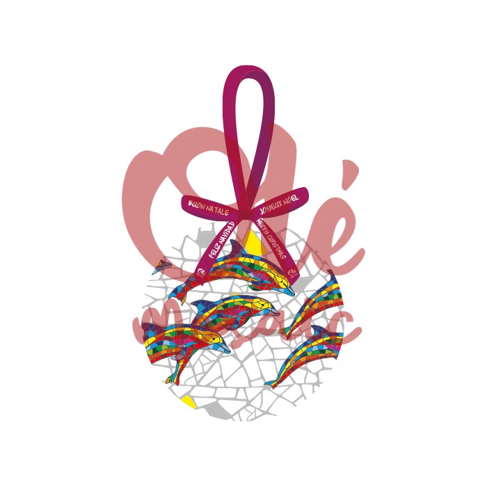 Decorative Christmas ornament presented in an elegant box, illustrated with colorful dolphins. This ceramic ornament features a contemporary design that combines vibrant tones with a mosaic background. The dolphins, depicted in motion, evoke the sea and the joy of the holidays. The ornament includes a decorative purple ribbon and festive texts in various languages, adding a perfect international touch to your Christmas tree.