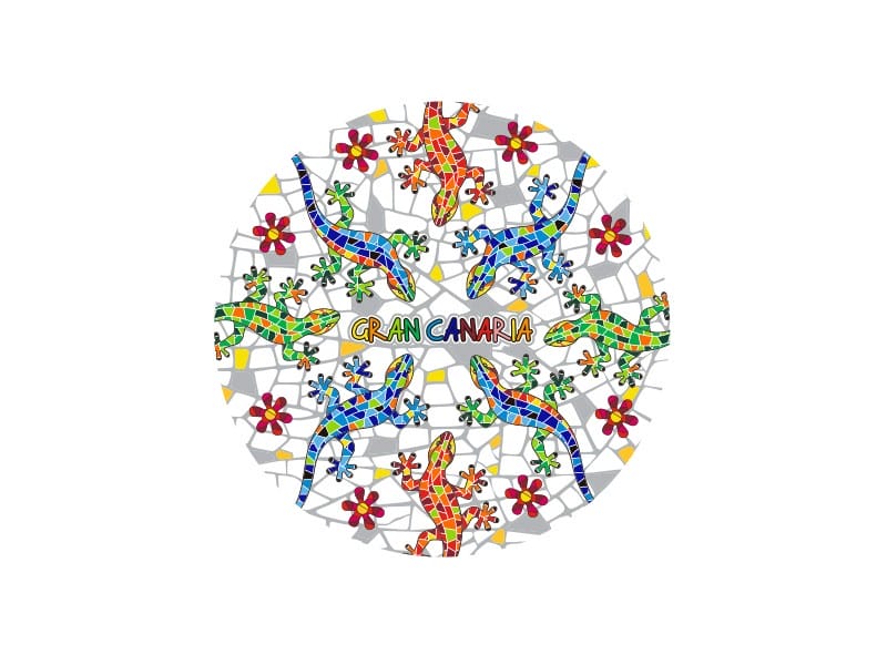 Ceramic coaster with a vibrant salamander design inspired by Gran Canaria’s fauna. This circular item features a colorful mosaic combining red, green, and blue tones, surrounded by brightly colored flowers. The inscription “Gran Canaria” stands out in the center, complementing the scene. Ideal for adding a touch of rich Canarian culture to your home, while protecting your surfaces with style and originality.