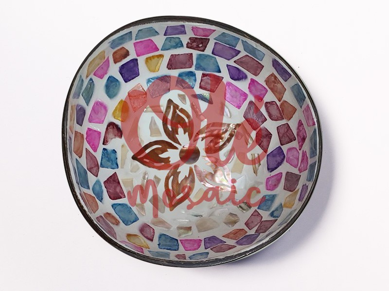 Coconut bowl decorated with floral motifs and multicolored mosaics. This attractive bowl features a handcrafted, hand-painted design with a beautiful flower at the center and a varied palette of colors including blues, pinks, and purples. The glossy surface highlights every detail of its intricate decoration, making it an elegant decorative accessory perfect for any home. Ideal for adding a touch of freshness and color to your table.