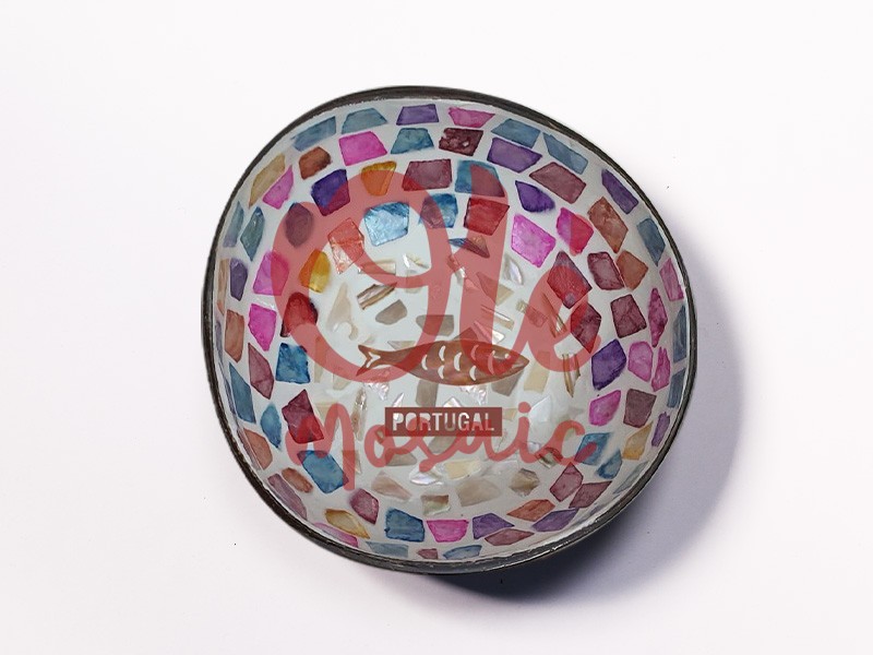 Coconut bowl decorated with a vibrant mosaic that represents the essence of Portuguese culture, ideal for enjoying snacks or as a decorative piece. This attractive coconut bowl features a captivating sardine design, an iconic symbol of Portugal’s gastronomy and maritime folklore. Its striking colors, in shades of blue, pink, and yellow, form a vibrant mosaic that evokes traditional Portuguese tiles, creating a visual effect that brings joy and color to any space.