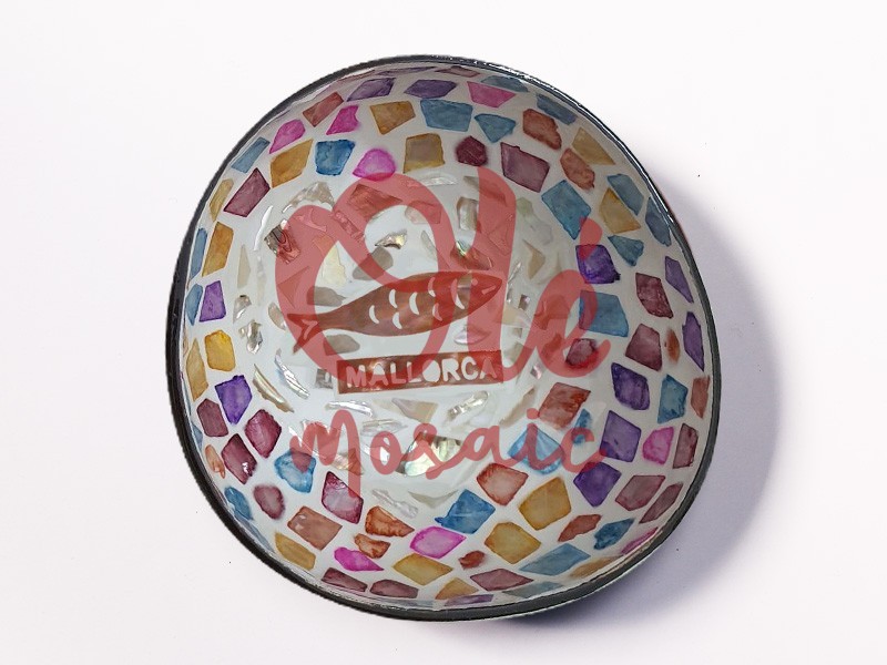 Decorative coconut bowl, inspired by Mallorca’s maritime tradition. This attractive bowl features a mosaic design with vibrant colors and mother-of-pearl details that catch the light, highlighting its oval shape. In the center, an illustration of a sardine with the word “MALLORCA” stands out elegantly. Ideal for serving appetizers or as a decorative piece, evoking the essence of the Mediterranean Sea.