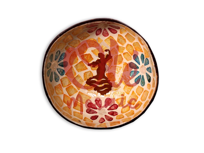 Handcrafted coconut bowl, hand-painted, decorated with vibrant floral motifs and an elegant flamenco dancer. This charming bowl represents the richness of Andalusian folklore, highlighting its characteristic silhouette against a mosaic background with warm colors such as yellow, red, and blue. Ideal as a decorative item or for serving appetizers, this bowl is a tribute to flamenco culture, evoking the passion and art of traditional dance.