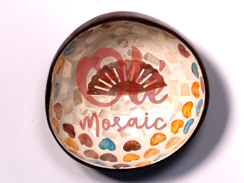 Coconut bowl with hearts, an exclusive decorative accessory inspired by traditional craftsmanship. Crafted from coconut, this bowl features a delicate mosaic of hearts in soft blue, orange, and brown tones, complemented by an elegant central design evoking a shell. Its natural and shiny finish enhances the beauty of the materials, making it an ideal piece to bring a warm and authentic touch to any home.