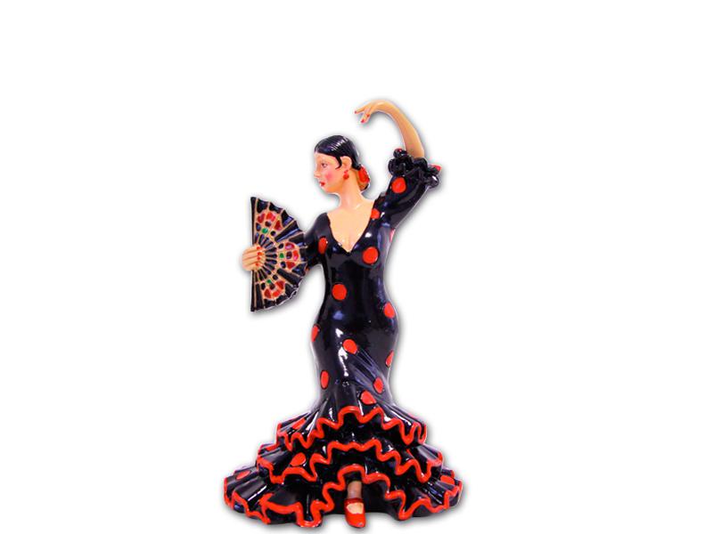 A 17 cm figure representing a flamenco dancer, artisanal design, hand-painted, with a vibrant black dress adorned with red polka dots. Her elegant attire is complemented by a wide ruffle at the bottom and details on the sleeves. The dancer holds a decorative fan that adds movement to the scene, capturing the essence of flamenco. Ideal as a souvenir reflecting the rich Andalusian culture.