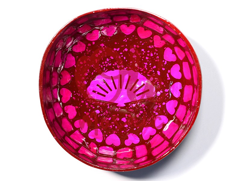 Fuchsia coconut bowl decorated with a vibrant design combining hearts and an elegant fan. This attractive item, crafted from coconut, stands out for its bright fuchsia color. The delicate specks and the contrast between the background and the decorative elements enhance its charm, making it an ideal piece to add a colorful and cheerful touch to any environment, evoking the festive spirit of Spanish culture.