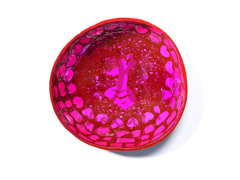 Handcrafted fuchsia coconut bowl, hand-painted, inspired by flamenco art. This vibrant bowl features the silhouette of a flamenco dancer in a subtle pink hue, surrounded by small hearts that evoke the passion of Spanish dance. The rim, decorated with a shiny finish, highlights its appeal and makes it an ideal piece to add a festive touch to any environment. Perfect as decoration or for everyday use, this bowl captures the essence of Spanish folklore.