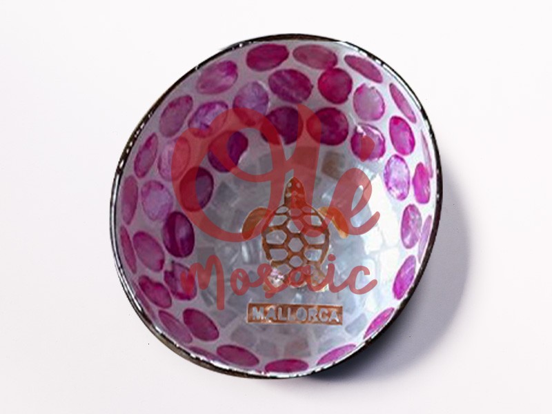 Fuchsia coconut bowl inspired by Mallorca’s marine life, featuring a very special mosaic design with a turtle at its center. This elegant bowl, crafted from coconut shell, boasts a bright and colorful finish in fuchsia and purple tones that give it a vibrant touch. The precisely engraved turtle symbolizes the natural beauty of the Balearic waters, making this bowl an attractive functional and decorative souvenir.
