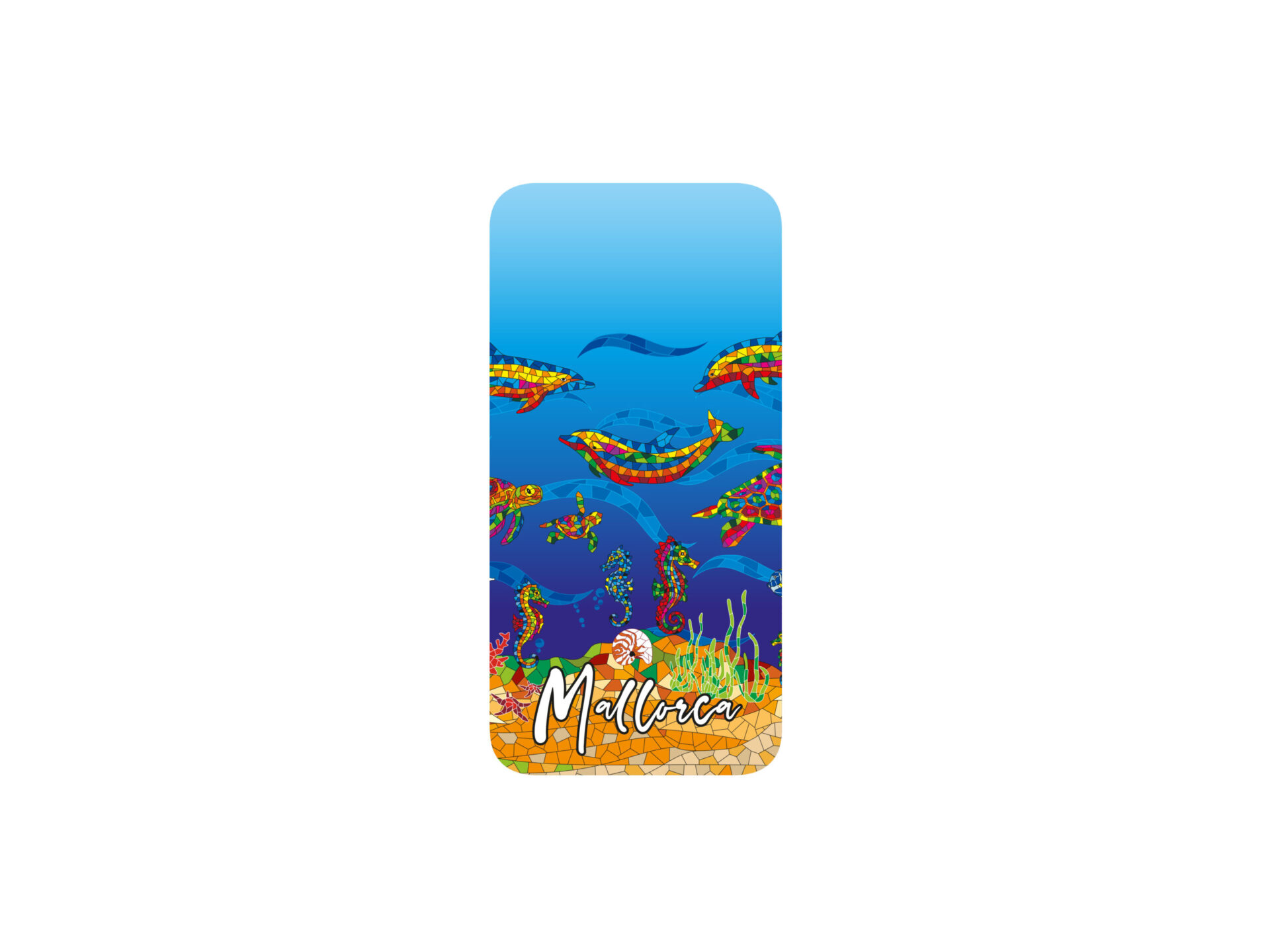 This iPhone 12 Pro Max case is a unique piece that reflects the marine beauty of Mallorca, designed for those who wish to take a piece of this wonderful island with them. Made of TPU, a flexible and durable material, it offers excellent protection against bumps and scratches, ensuring the safety of your device while highlighting your personal style. The case features colorful marine motifs, with vibrant illustrations of fish, turtles, and seahorses, all on a blue background that evokes the tranquility of the Mediterranean. At the bottom, a mosaic that pays homage to Mallorca’s artisan traditions adds a distinctive and cultural touch to the piece, while the text “Mallorca” complements the design with elegance. This souvenir is not just a practical accessory for your phone, but also a representative memory of the rich Mediterranean culture. As distributors of authentic products, at Olé Mosaic, we offer this marine case as an excellent option for tourist gift shops, ideal for tourists looking for souvenirs that capture the essence of their trip. With this case, every time you take out your phone, you’ll remember the beautiful underwater life of Mallorca.