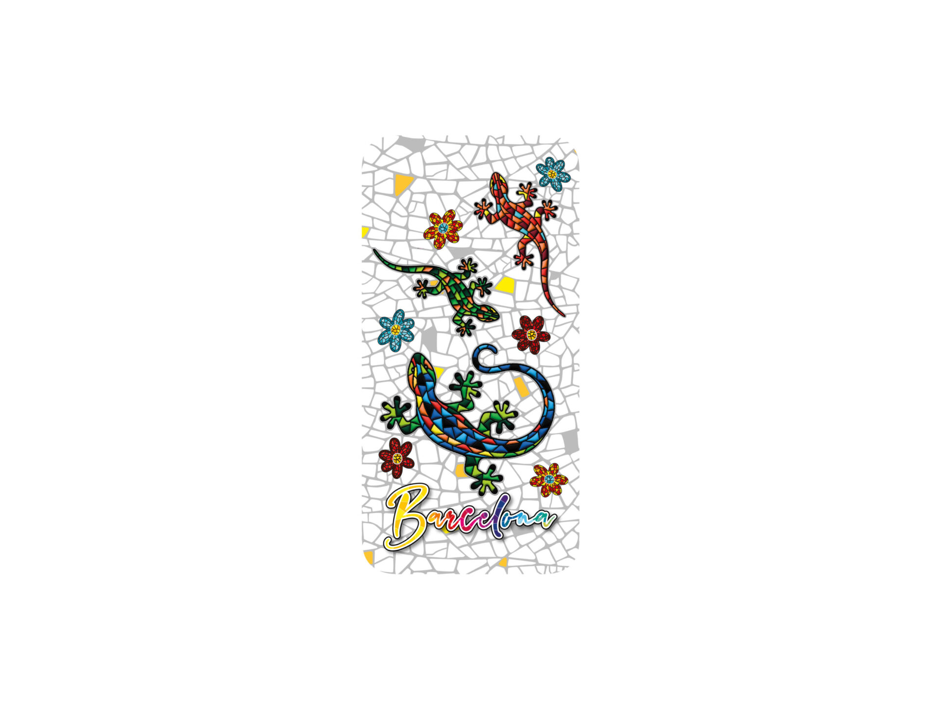 This iPhone 12 case is an authentic tribute to vibrant Barcelonan culture. Made from high-quality TPU, it combines protection and aesthetics in a single product. Its design features a captivating salamander surrounded by colorful flowers, transporting the wearer to the emblematic mosaics of Gaudí’s work, present in Park Güell. The white base of the case is adorned with a mosaic pattern that evokes the city’s modernist architecture, creating a vibrant contrast with the blue, green, red, and yellow tones of the illustrations. The name “Barcelona” stands out in a striking style, reinforcing its connection with this iconic city.
