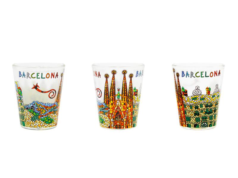 Glass shot glass with a colorful panoramic view of Barcelona. This attractive design features representative mosaics of the city, including the emblematic Sagrada Familia and other iconic monuments. Decorated with vibrant colors and the word “Barcelona”, this glass is ideal for enjoying a shot while remembering the beauty of the city. Perfect as a souvenir or for daily use, it combines style and functionality.