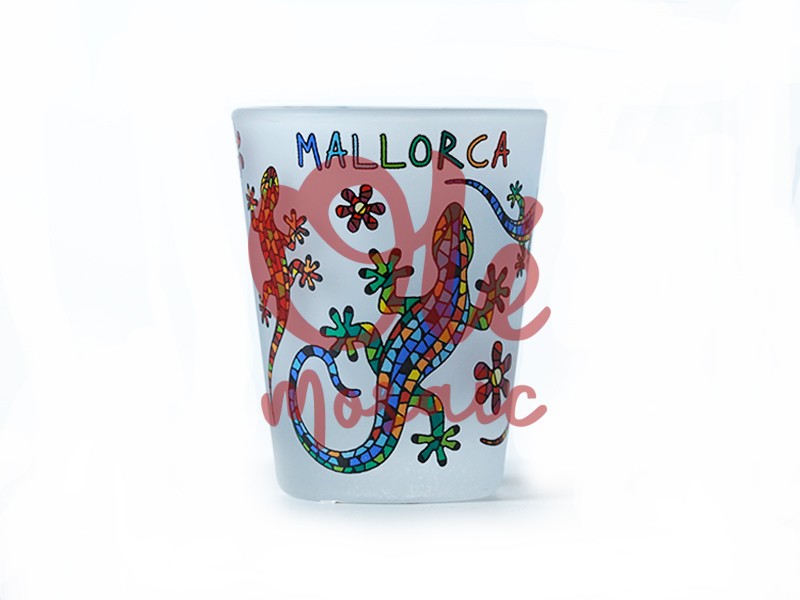 Glazed glass shot glass decorated with a vibrant design of salamanders and flowers, emblematic of Mallorca. The glass features a smooth and translucent finish that highlights the vivid colors of the motifs, where the salamanders are illustrated in a multi-colored mosaic style. The word “MALLORCA” is printed on the upper part, adding a distinctive touch that celebrates local culture. Ideal for enjoying drinks in a festive atmosphere.