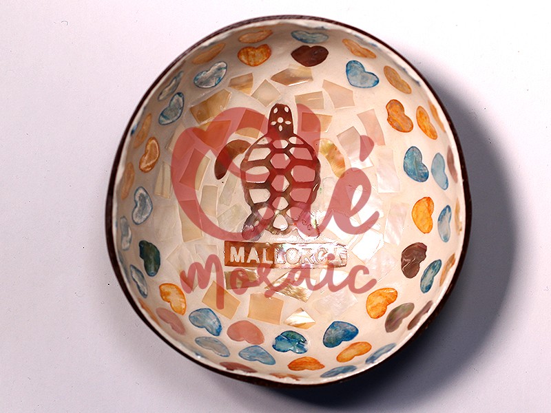 Coconut bowl decorated with colorful hearts and a charming turtle, representing the essence of Mallorca. This handcrafted product stands out for its mosaic technique, combining shell pieces and vibrant colors in the shape of hearts. In the center, a turtle in brown tones stands out against a clear background, adding a distinctive touch. Ideal as a decorative piece or for storing small items, this bowl reflects the folklore and natural beauty of the island.