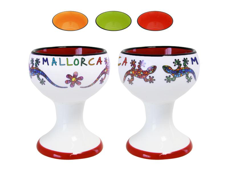 Hand-painted artisan ceramic egg cup, inspired by Mallorca’s folklore. This unique design features two charming salamanders decorated with vibrant colors and flowers, along with the word “MALLORCA”. The beige base is combined with red borders, adding a Mediterranean touch. Ideal for elegantly presenting eggs, this product enhances local culture and traditional Majorcan craftsmanship, perfect for adding a special touch to any table.