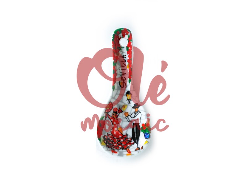 Handcrafted, hand-painted ceramic magnet inspired by the vibrant atmosphere of a Sevillian patio. This attractive magnet features a colorful illustration of a couple dancing flamenco: the ‘bailaora’ wears an elegant red dress, while the ‘bailador’ is dressed in traditional attire. In the background, flowerpots and a street lamp are visible, evoking the joy of Seville’s festivities. The piece includes the word “Sevilla” at the top, adding a local touch.