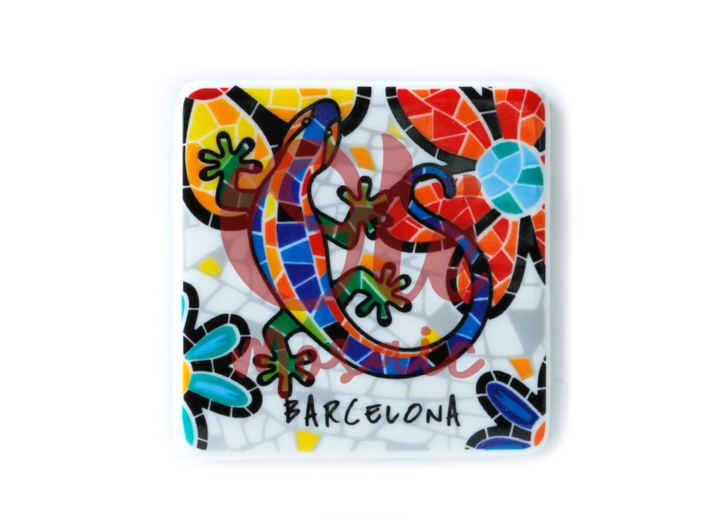 Olé Mosaic » Magnets » Ceramic magnet. Salamander and flowers. Gaudí. Barcelona. White.