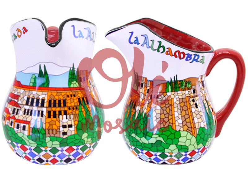 Decorative ceramic jug inspired by the majestic Alhambra of Granada. This piece features a vibrant design in beige, red, and green tones depicting the emblematic fortress and its gardens, all in a mosaic style. The colorful details evoke the rich cultural heritage of the region. With a handmade, hand-painted finish, this jug is ideal for enjoying drinks or as a decorative element in your home.