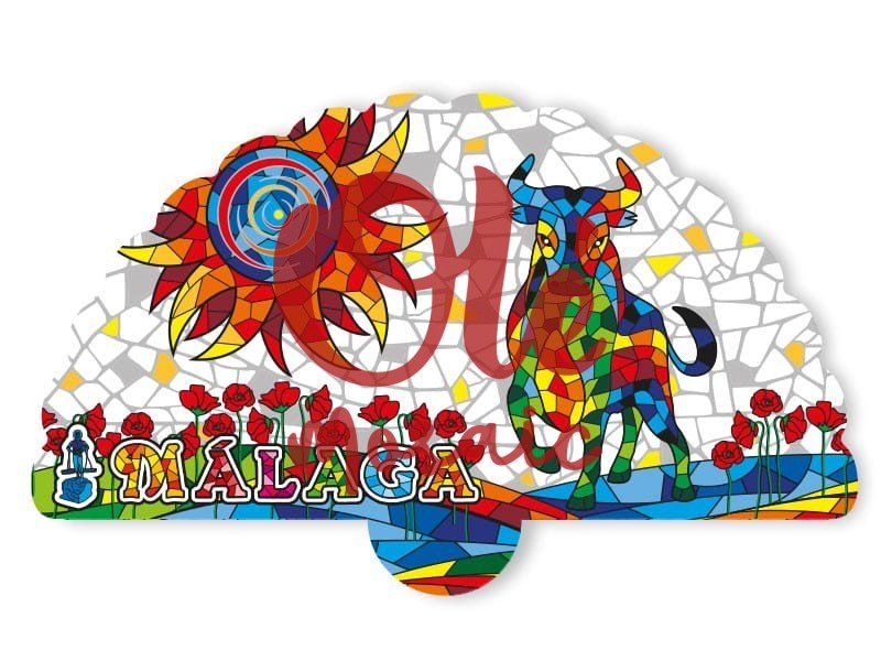 Colorful magnet, inspired by Malaga’s bullfighting tradition. This attractive magnet features a vibrant design with a bull standing out in blue, green, and red tones, alongside a radiant sun and roses that evoke Andalusian folklore. The mosaic base gives it a distinctive touch, while the text “MÁLAGA” highlights its connection to the city. Ideal for those who wish to carry a piece of Malaga’s culture with them.