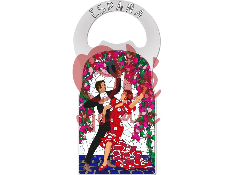 This decorated metal bottle opener is an authentic celebration of Spanish folklore, specifically the vibrant art of flamenco. Crafted with an elegant epoxy layer, it features a colorful illustration that captures two flamenco dancers in full motion, enhancing the intensity of the dance. The design shows a female dancer dressed in a striking red ruffled dress with details that evoke the passion of flamenco. Beside her, her partner, in a classic outfit that complements the traditional aesthetic, holds a hat while performing an elegant step, creating a dynamic scene.