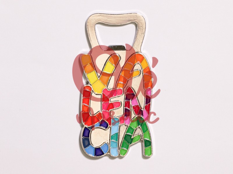 Handcrafted metal bottle opener, hand-painted, inspired by the vibrant colors of Valencia. This elegant bottle opener features the word “VALENCIA” in stylized letters, decorated with a mosaic of vivid colors including orange, red, blue, and green tones. The design captures the essence of the city, evoking its rich cultural and artistic tradition. Its metallic finish not only makes it functional but also transforms it into an attractive souvenir or decorative piece.