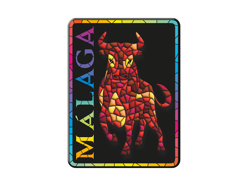 Metallic magnet with the iconic bull design, a cultural symbol of Spain and Malaga’s bullfighting tradition. Measuring 8 cm, this magnet stands out for its colorful mosaic in red and yellow tones on a black background, creating a vibrant and striking effect. The word «MÁLAGA» is highlighted in prominent letters, adding an artistic and modern touch, perfect for remembering the essence of the city.