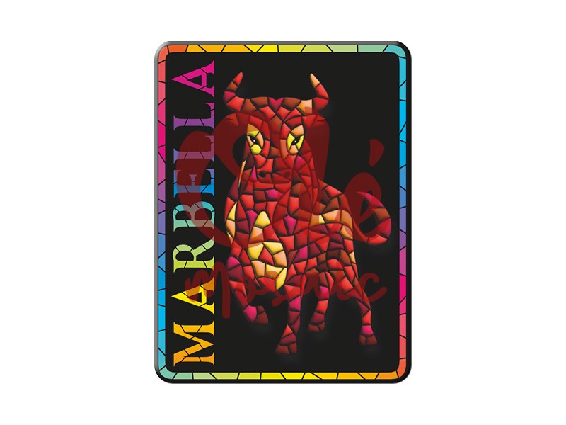 8 cm metal magnet decorated with a vibrant bull, a faithful reflection of the essence of Marbella. This magnet, with a black background, features a mosaic design in red, yellow, and orange tones that add dynamism and color. The word “MARBELLA” is printed with a modern typography, adding a contemporary touch. Ideal for evoking the Spanish bullfighting tradition while decorating your refrigerator or any other space.