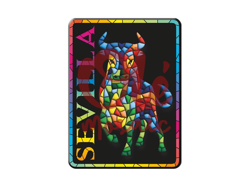 Metallic bull-shaped magnet, a symbol of Seville, 8 cm. This vibrant magnet features a colorful mosaic-style design, with various tones on a black background, creating a dynamic visual appeal. The word “SEVILLA” stands out in large letters on one side, reinforcing the connection to the city. Ideal for decorating any metallic surface and evoking Spanish culture and tradition.