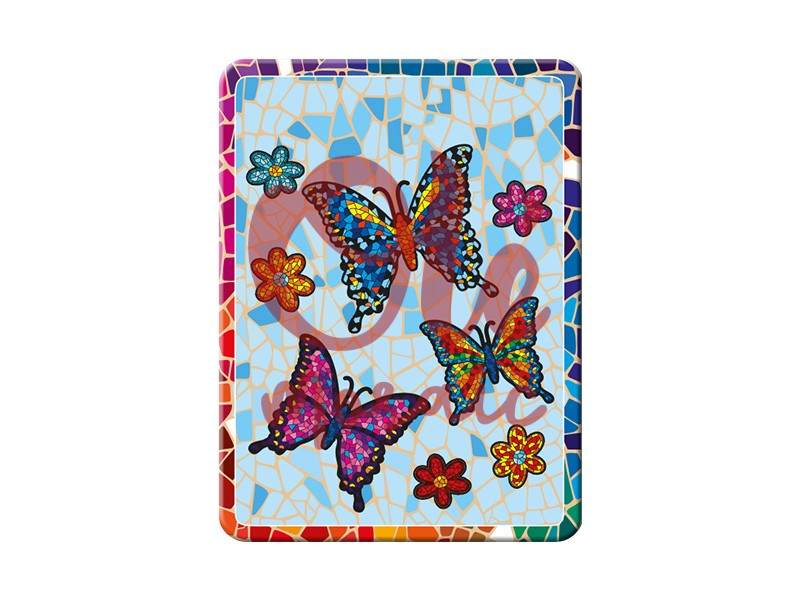 The design is inspired by mosaic art, a distinctive element of Spanish culture, known for its rich history and its use in decorating emblematic spaces, such as Casa Batlló in Barcelona. The delicacy of the butterflies, each with unique and striking details, intertwines with a mosaic-simulating background, highlighting not only the diversity of the species but also the artistic skill that characterizes Spanish craftsmanship.