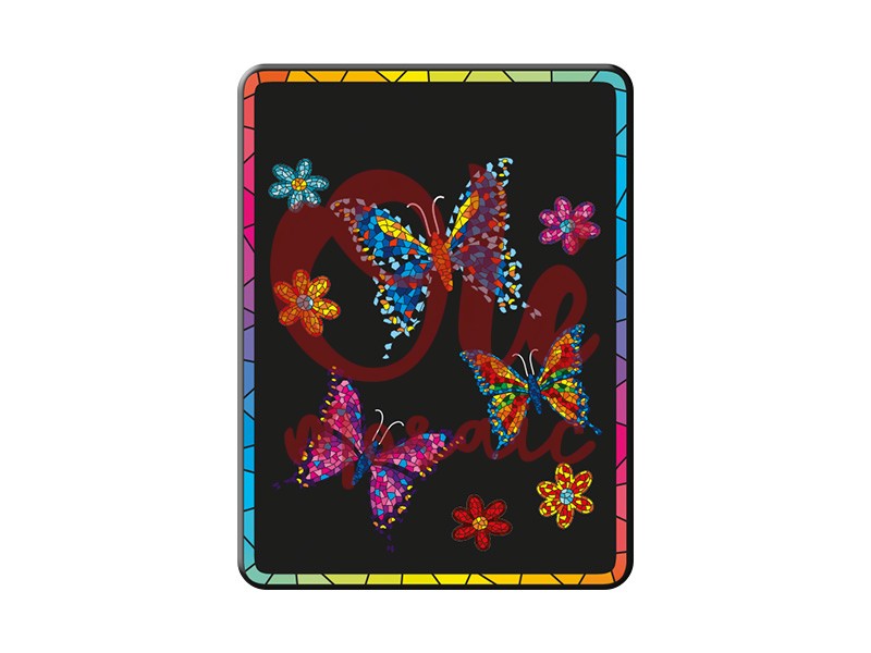 Metal magnet decorated with colorful butterflies and flowers, ideal for remembering the vibrant Spanish fauna. This 8 cm magnet features a black background that enhances the vivid colors of the butterflies, ingeniously designed with a mosaic motif that captures the artistic essence of Spanish culture. The butterflies, represented in a variety of shades, from vibrant red to intense blue, evoke the diversity and beauty of nature that characterizes Spanish regions, while the colorful flowers add a touch of freshness and joy.