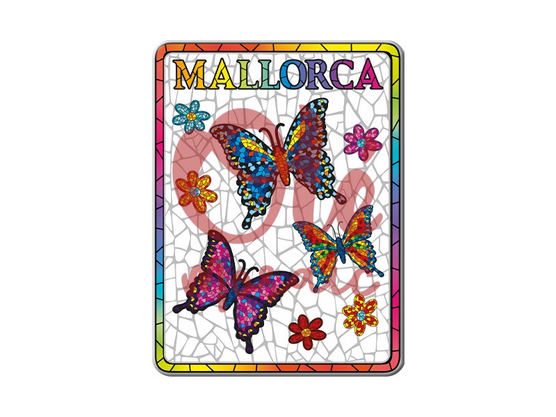 This 8 cm metal magnet, with a vibrant design of colorful butterflies, is a unique souvenir of beautiful Mallorca. It features a splendid set of stylized butterflies in blue, orange, and black tones, which seem to come alive against a mosaic background. This background, evoking the rich beauty of the island, is also adorned with delicate flowers that add a touch of freshness and joy to the design. The word “MALLORCA” is located at the top, highlighting the direct connection to this iconic Mediterranean region.