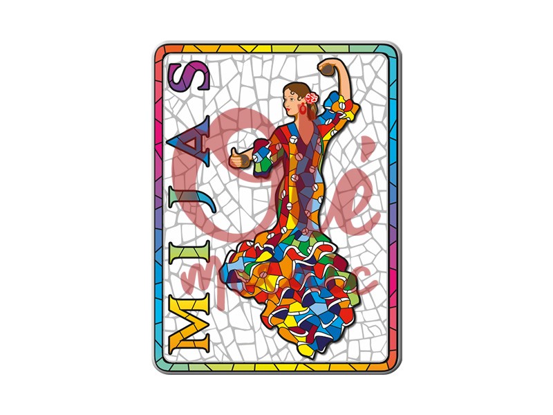 An 8 cm metal magnet that captures the essence of Spanish folklore, featuring a flamenco dancer in a brightly colored costume. Inspired by Mijas, this magnet showcases a handmade, hand-painted design with a mosaic effect, highlighting the dynamism of flamenco dance. The gracefully and joyfully posing dancer is accompanied by the word “MIJAS” in striking colors, making this magnet an attractive souvenir of Andalusian tradition.