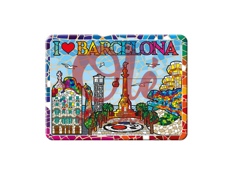 An 8 cm metal magnet featuring a vibrant panoramic view of Barcelona. Decorated with a trencadís design, this magnet showcases emblematic icons like the Sagrada Familia and Miró, enhanced by a colorful and striking background. The inscription “I ♥ Barcelona” stands out at the top, capturing the city’s spirit. Ideal as a souvenir, this magnet combines art and symbolism, making it an essential piece for Barcelona lovers.