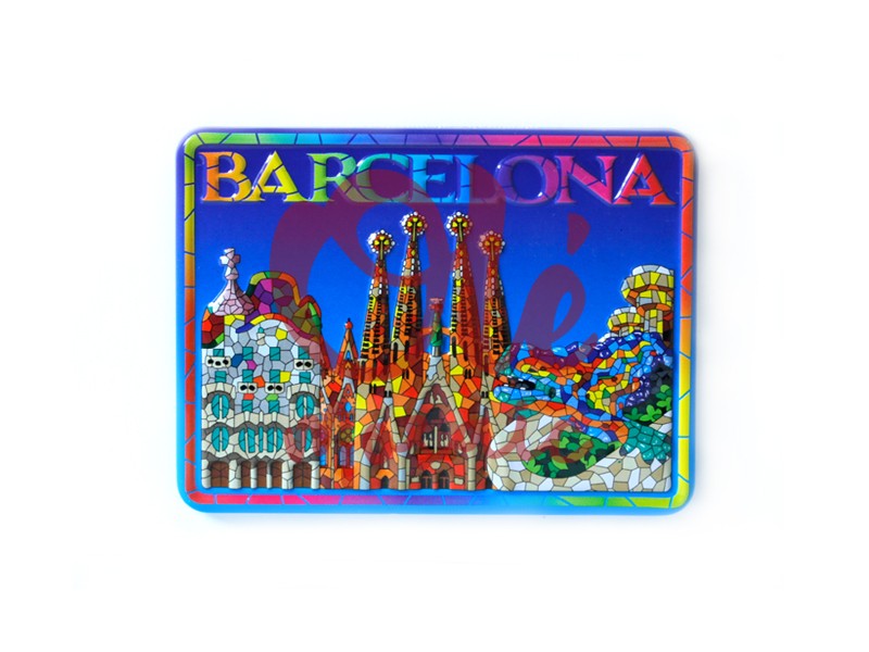 Metallic magnet with a colorful panoramic view of Barcelona, highlighting iconic elements such as the Sagrada Familia and Park Güell. Measuring 8 cm, this magnet features a vibrant design in blue, red, and green tones, imitating a mosaic and capturing the city’s artistic essence. The word “Barcelona” is printed at the top, adding a distinctive touch that makes it a perfect souvenir of this emblematic city.