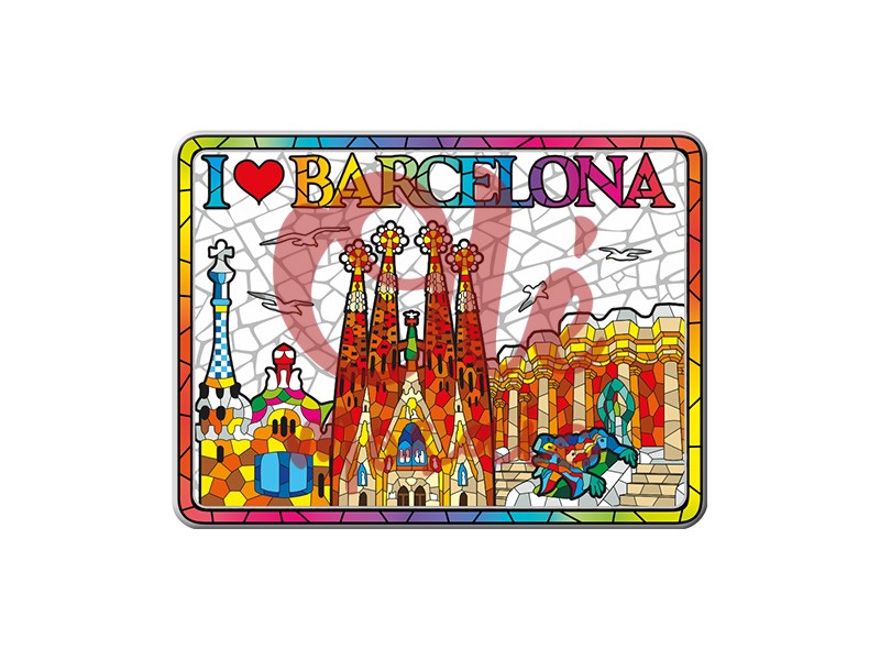 This 8 cm metal magnet featuring a vibrant panoramic view of Barcelona is the perfect souvenir to remember the beauty and unique character of the Catalan capital. The design showcases a colorful representation of the iconic Sagrada Familia and Park Güell, two masterpieces by the renowned architect Antoni Gaudí, iconic for their undulating forms and exuberant use of color. In red, blue, and yellow tones, the magnet evokes the modernist style that characterizes Barcelona’s architecture, creating a captivating visual effect that captures the city’s essence. The phrase “I ♥ Barcelona” stands out at the top, adding a personal and fun touch to the souvenir, ideal for tourists looking to take a piece of this vibrant metropolis home. Its silver finish gives it an elegant and attractive appearance, making this magnet not only a functional keepsake but also a decorative element that will brighten any refrigerator or metallic surface. At Olé Mosaic, we are experts in wholesale souvenir distribution, and this Barcelona magnet is a magnificent option for tourist gift shops that wish to offer authentic and quality products. With this magnet, visitors will be able to relive every moment of their trip to Barcelona, turning it into a true cultural treasure.