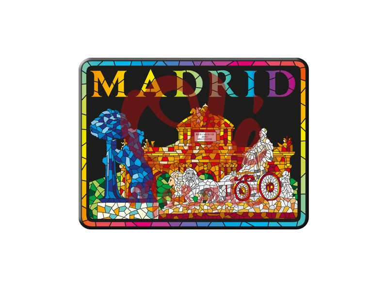 Metallic magnet with a vibrant panoramic view of Madrid, 8 cm. It features a stylized mosaic design, highlighting the emblematic monument of Puerta de Alcalá and the famous Bear and the Strawberry Tree. The vivid and contrasting colors, with a predominance of blues, yellows, and reds, enhance the city’s beauty. The name “MADRID” is printed in large, colorful letters on a black background, adding a modern touch to this souvenir.
