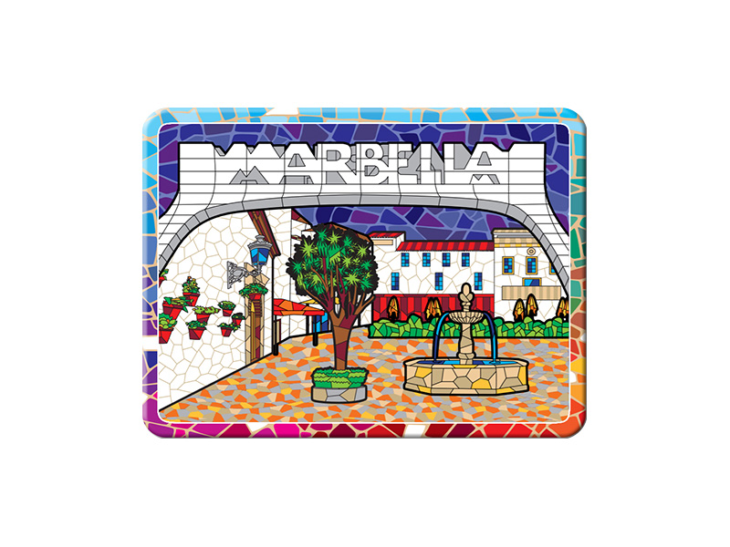 Metal magnet with a panoramic view of Marbella, an exquisite souvenir that encapsulates the vibrant essence of this famous Andalusian coastal city. Measuring 8 cm, this magnet stands out for its design in a vibrant mosaic style that combines cheerful colors and carefully crafted details. In the center of the image, a charming fountain surrounded by ornamental trees and typical Andalusian houses adorned with flowerpots is presented in an artistic composition that evokes the warmth of the Mediterranean climate and the beauty of Marbella’s landscapes. The name “MARBELLA” is elegantly placed at the top, creating a focal point that accentuates the city’s identity.