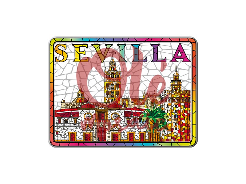 The bright colored background combines a cheerful and dynamic palette with prominent text highlighting the word “SEVILLA” (Seville), making this magnet a representative and attractive souvenir. The quality of the metal used guarantees its durability, ensuring that this souvenir maintains its splendor over time. It is the ideal souvenir for tourists who wish to take a piece of Seville’s beauty home, capturing the essence of the city’s vibrant lifestyle.