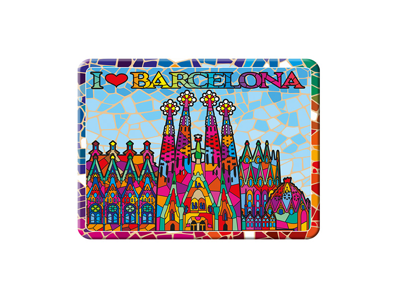 8 cm metallic magnet inspired by Barcelona’s iconic Sagrada Familia. This vibrant magnet features a colorful design with a mosaic highlighting the impressive towers and architecture of Gaudí’s masterpiece. The legend “I ♥ BARCELONA” adds a modern touch, while the intense colors and geometric shapes capture the artistic essence of the city. Ideal for remembering your visit to Barcelona or as a gift for friends.