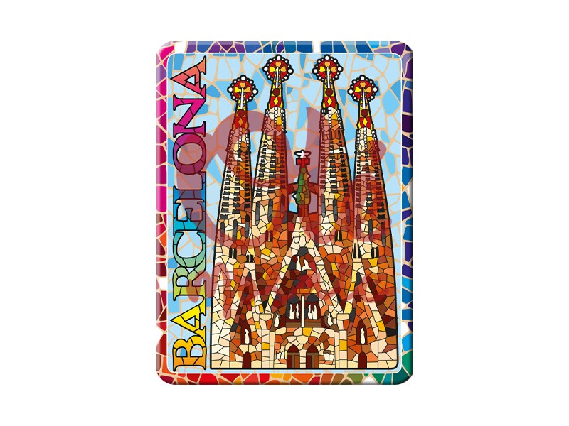 8 cm metal magnet, decorated with a vibrant mosaic of the Sagrada Familia, an emblematic symbol of Barcelona. This magnet features a colorful and detailed illustration that captures the monument’s iconic towers, with touches of red, yellow, and blue that evoke the brilliance of Gaudí’s design. Perfect for remembering your visit to the city, it is an ideal souvenir for any art and architecture lover.