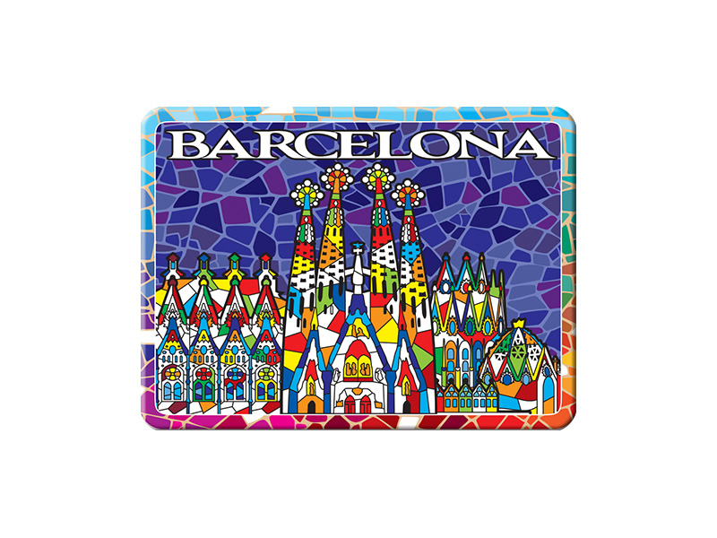 8 cm metal magnet representing the famous Sagrada Familia in Barcelona. This colorful magnet highlights the architectural elements of the emblematic monument, with vibrant details in red, blue, yellow, and green tones, evoking Antoni Gaudí’s modernist style. The background features a mosaic that complements the majesty of the church, while the word “Barcelona” stands out at the top, making it an attractive souvenir of the city.