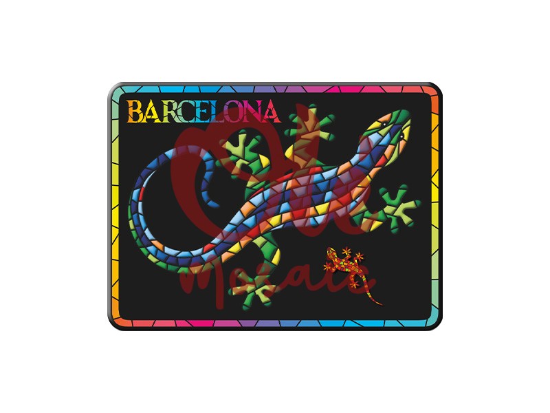 This 8 cm metal magnet features a colorful salamander, an iconic design associated with the vibrant city of Barcelona. Its black background highlights a vibrant motif, composed of multicolored mosaics that evoke the famous modernist style characterizing the city’s architecture. The salamander is displayed in a dynamic pose, highlighting its smooth lines and splendid design, capturing the essence of Barcelona’s artistic creativity. Beside it, a small lizard adds additional charm, enriching the composition and bringing a touch of local biodiversity.