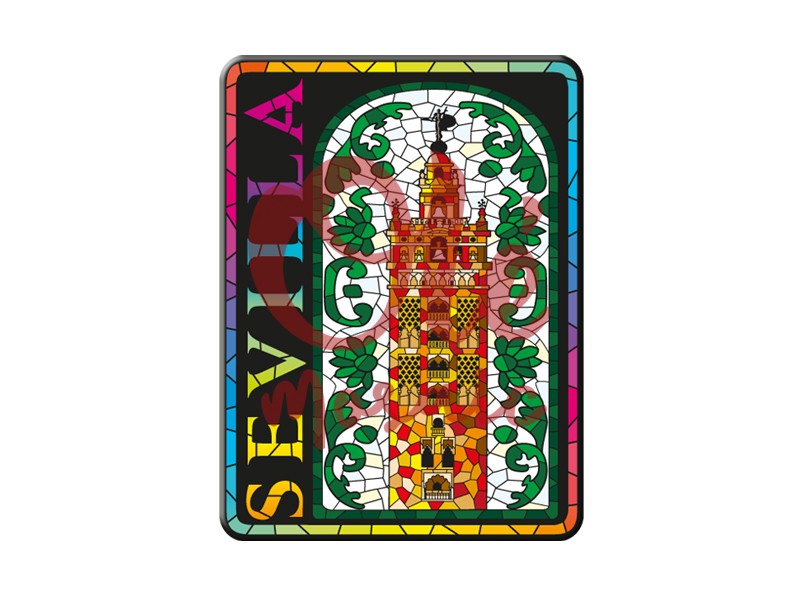 This metal magnet with the Giralda is an emblematic souvenir of Seville, ideal for those seeking an authentic souvenir that captures the essence of this vibrant Andalusian city. Measuring 8 cm, it features an attractive design inspired by traditional tiles, notable for its use of bright colors such as yellow, red, and green, on an elegant black background. The Giralda, the famous tower of Seville Cathedral, is represented in great detail, achieving a visual aesthetic that evokes the majestic views of the city.