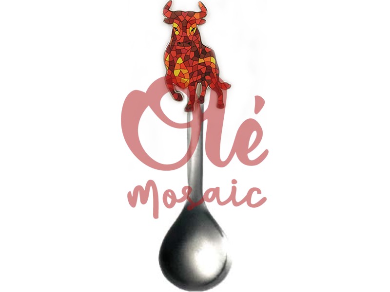 Metal spoon decorated with an iconic bull design, representing Spanish folklore. At the top, the bull is crafted with a mosaic of bright red and orange colors, highlighting its robust and proud figure. This item combines functionality and art, ideal for lovers of Spanish culture. Its metal base provides durability, while the artistic design adds a distinctive touch to the table.