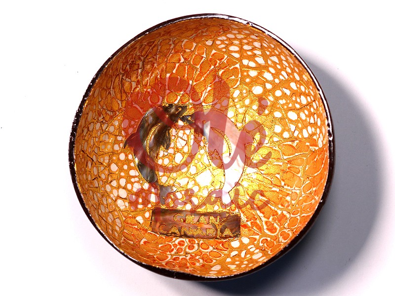 Orange coconut bowl, decorated with an illustration of two dolphins that evoke the marine beauty of Gran Canaria. This beautiful bowl, made from a coconut shell, features an artisanal, hand-painted design technique that highlights its unique texture and warm orange tones. At the base, a mother-of-pearl detail captures the essence of the Canary archipelago, making it an ideal decorative object for any home or as a souvenir.
