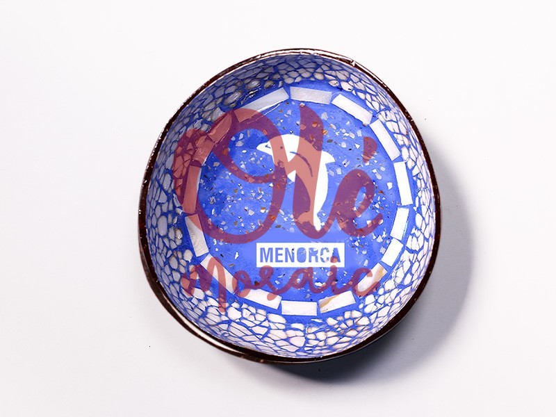 Decorative coconut bowl from Menorca, with an attractive design in blue tones that evoke the beauty of the Mediterranean’s crystal-clear waters. This exquisite bowl features an elegant drawing of a dolphin, a symbol of the region’s marine fauna, framed by a decorative mosaic detail that reinforces its artisan aesthetic. With the name “MENORCA” printed on the front, this piece stands out both for its functionality, ideal for serving small appetizers or as a decorative element, and for its authenticity as a representative souvenir of the island. Its oval shape and handcrafted finish highlight the natural beauty of the material, making it an ideal complement for any home seeking a touch of Mediterranean charm. This coconut bowl is not just a decorative object; it also has a significant cultural link, as it reflects Menorca’s rich artisan tradition and the love for nature that characterizes its inhabitants. At Olé Mosaic, as a wholesaler of souvenirs, we offer this coconut bowl as an excellent option for tourist gift shops looking for unique and quality products, perfect for those tourists who wish to take a piece of Menorca home.