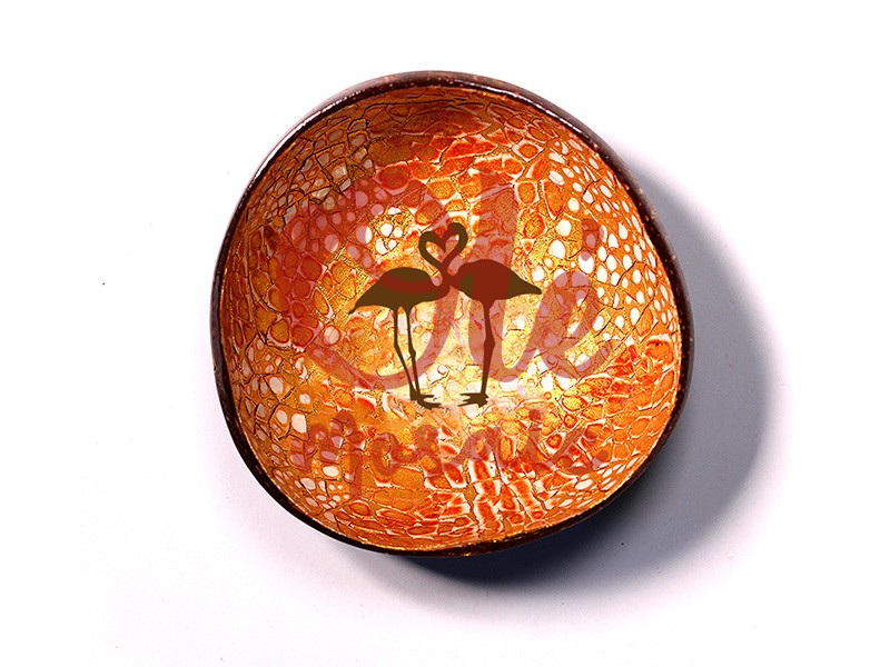 Orange coconut bowl, decorated with the charming design of two intertwined flamingos. This beautiful, carefully crafted bowl features an organic texture and a bright finish that highlights its vibrant color. Its design evokes the warmth of Spanish folklore, ideal for serving appetizers or as a decorative element. Perfect for adding an exotic and joyful touch to any home, evoking the magic of Mediterranean culture.