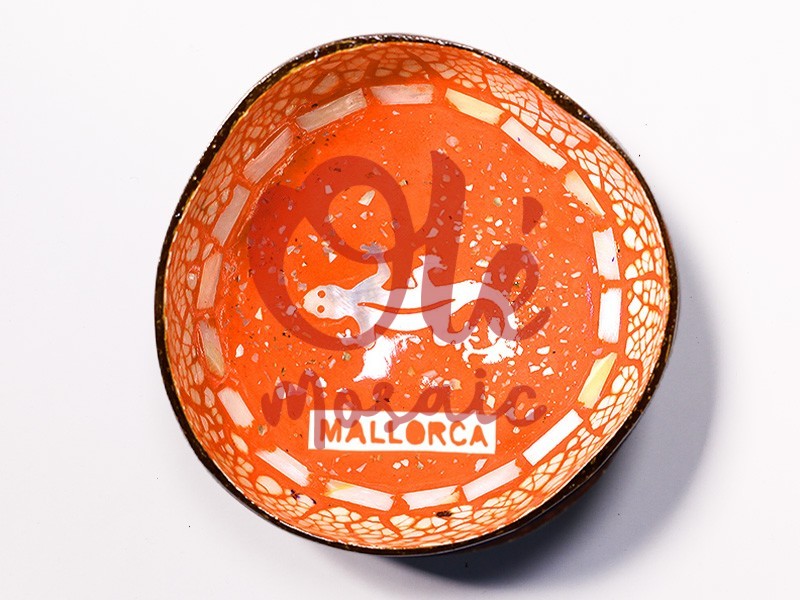 Orange coconut bowl decorated with a striking salamander, a unique souvenir from Mallorca. This bowl features a vibrant orange interior with an elegant design that includes a white salamander figure and the inscription “MALLORCA”. Its organic shape and detailed finish highlight the product’s artisanal beauty, making it an attractive decorative element for any space. Perfect for adding a touch of Mallorcan tradition to your home.