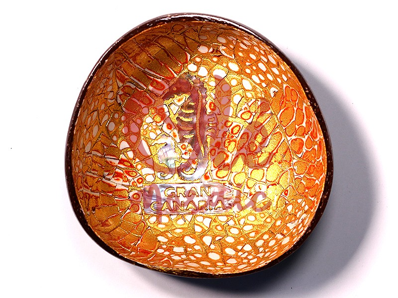 Orange coconut bowl, decorated with a charming seahorse representing Gran Canaria’s marine culture. This beautiful handcrafted item features an artisanal, hand-painted design with vibrant details that enhance the coconut’s texture. In the center, the inscription “Gran Canaria” stands out with an elegant finish. An ideal souvenir that encapsulates the essence of the ocean and local life, perfect for decorating any corner of the home.